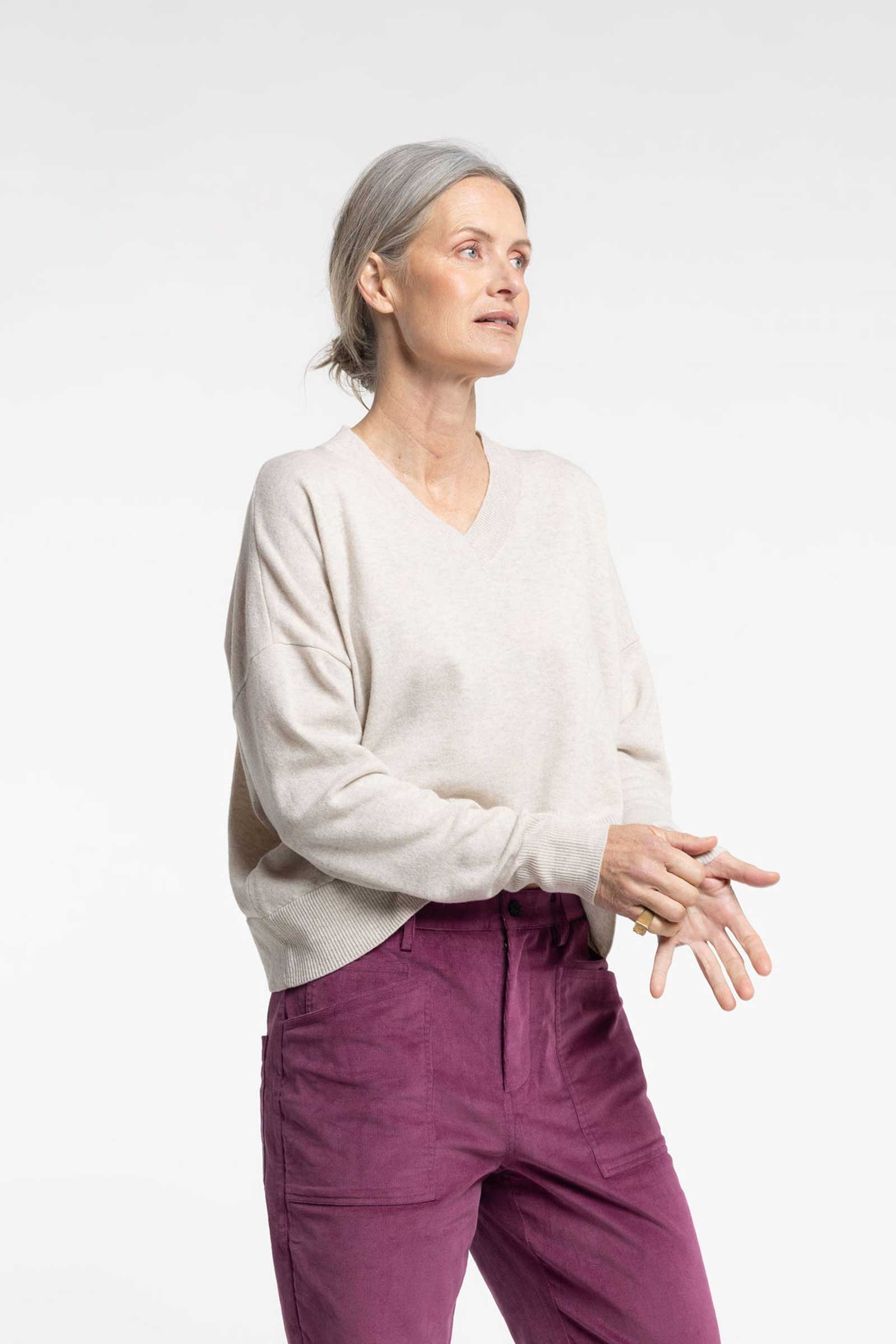 The Griddy Sweater is the perfect blend of comfort and effortless style. Designed with a relaxed fit and a cropped V-neck silhouette, this sweater is ideal for layering or wearing on its own. Crafted from 100% merino wool, it offers breathability, softness, and warmth. Featuring a ribbed neckline and cuffs, it adds structure to the laid-back design. Whether paired with high-waisted trousers or denim, the Griddy Sweater is a versatile wardrobe staple that delivers casual elegance with a conscious touch.