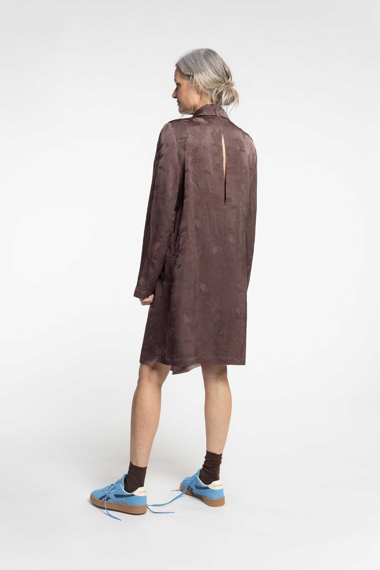 Meet the Casey Coat. A lightweight Duster coat, crafted from satin jacquard featuring side pockets and a single button closure under the collar. It's the perfect, effortless finish to any outfit, ideal for the style-savvy individual on the go. Perfect for pairing with denim or a wide leg trouser.