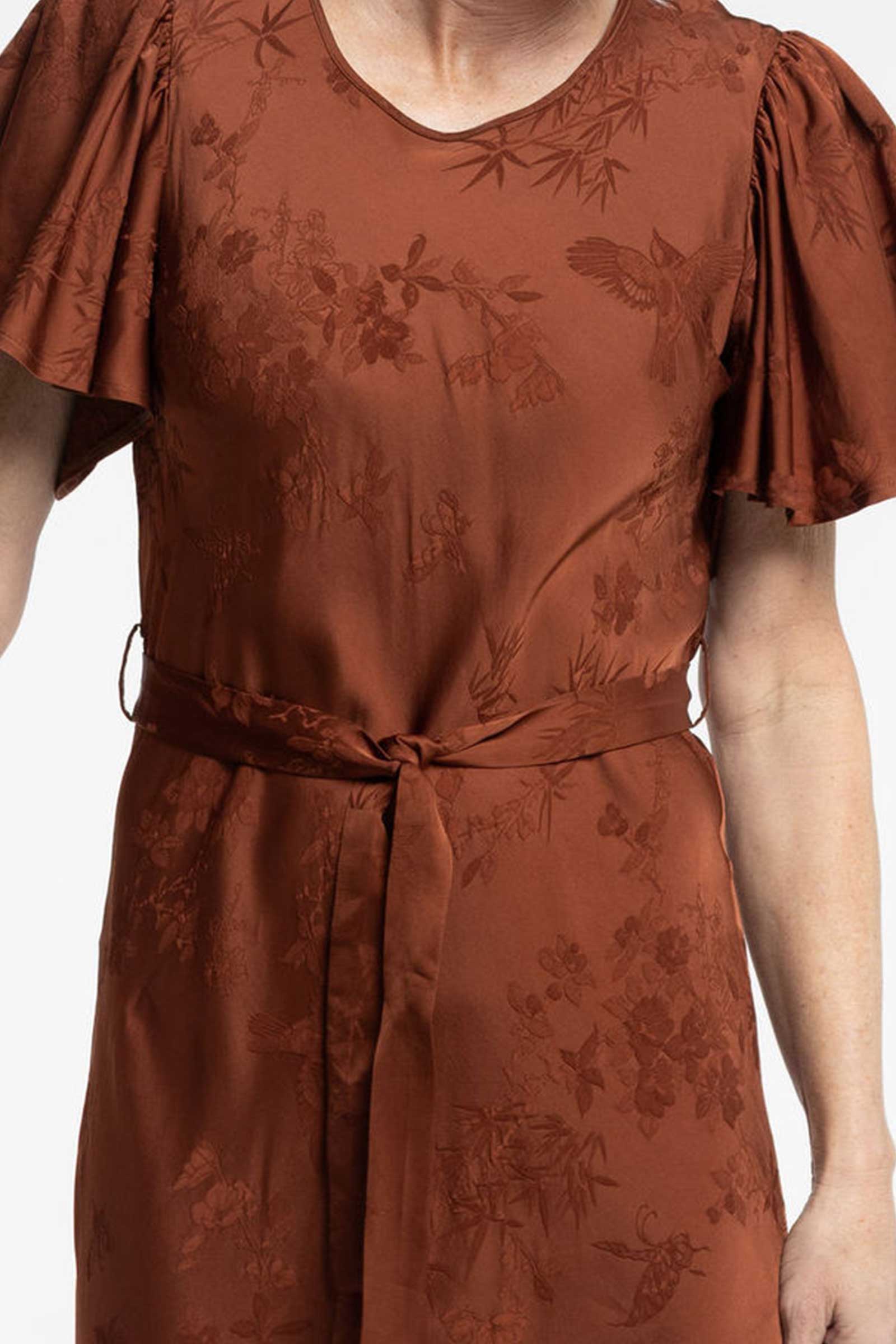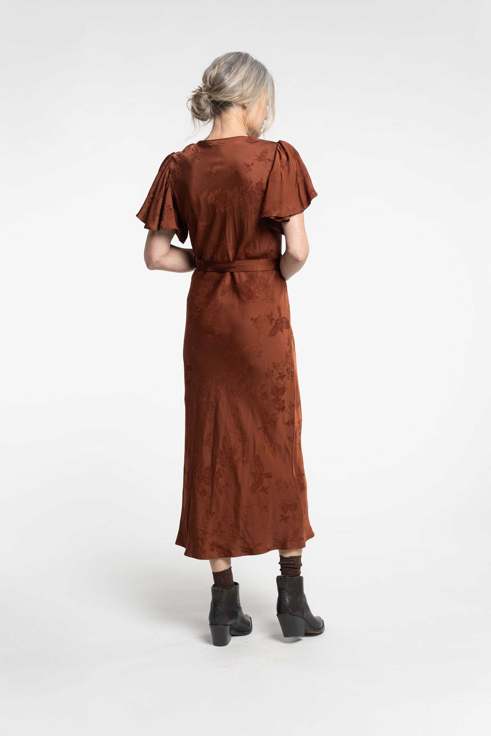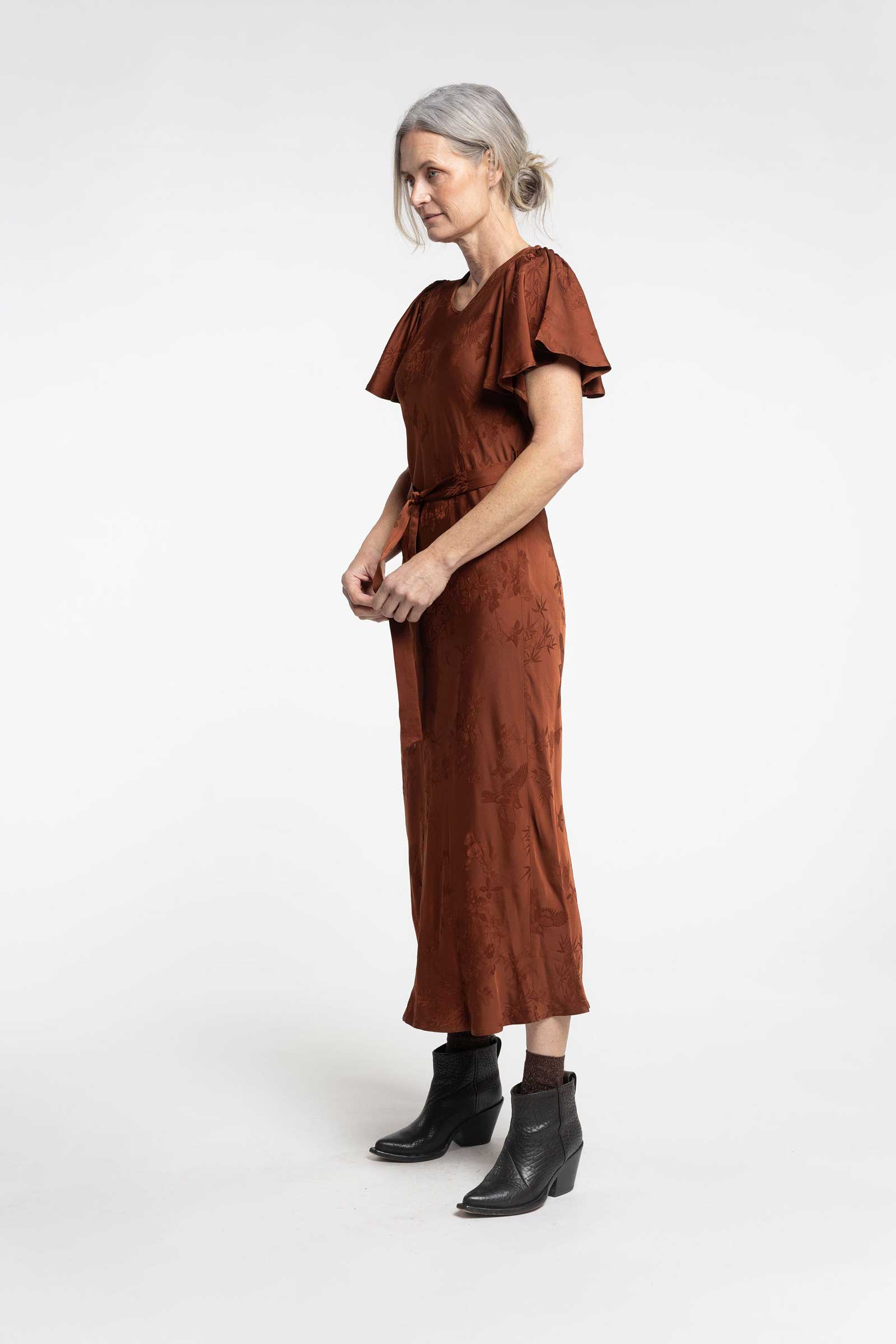 Introducing the Devon Dress in Cinnamon, an effortless silhouette designed for understated elegance and everyday wearability. Crafted from 100% viscose jacquard, the fabric features a subtle woven texture that adds depth and richness to the warm cinnamon tone. Cut on the bias, the dress gently skims the body, creating a naturally flattering drape and fluid movement with every step.